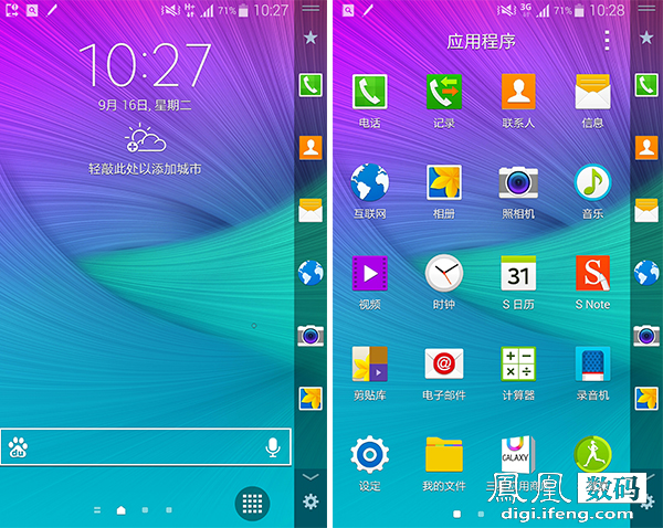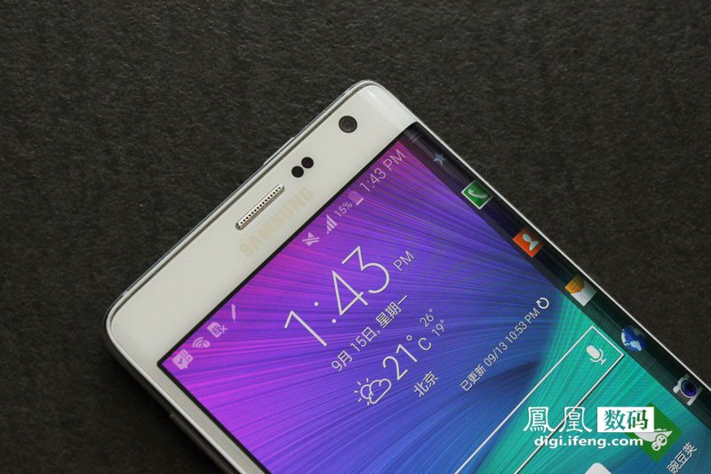 从快捷图标栏向左滑动弯曲侧屏,界面会先后切换到“GALAXY Note Edge”名称页和通知栏。其中名称页仅仅是一个装饰,没有功能性的作用,而通知栏则和屏幕顶部的通知栏相似,其中还包括天气信息。