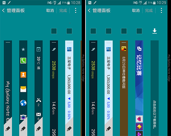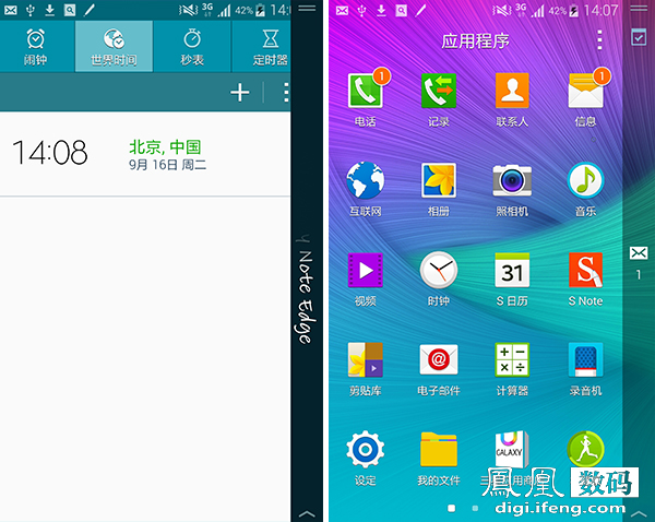 由于系统和Note 4一致,因此我们这个环节的重点集中在Note Edge的这个弯曲侧屏上。侧屏主要还是定位于辅助。在我们运行App时,这个侧屏会显示其他状态或者是工具,方便用户同时处理其他任务以及快速切换,与Windows的任务栏和OS X上的Dock在功能性上很相似。