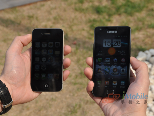 除了可视角度方面,我们将两款手机拿到正午的阳光下进行屏幕观察,尽管iPhone 4S屏幕搭载视网膜显示技术,但是在这个对比环节中,三星GALAXY SII的屏幕优势比较明显,Super AMOLED的自发光特性不仅比较省电,同时轻薄的材质也提供了高透光率,在正午的阳光下,三星GALAXY SII的屏幕显示依旧清晰,依然还可以看到系统时间,相对iPhone 4S的屏幕略显暗淡,一些细节信息已经看不到了。