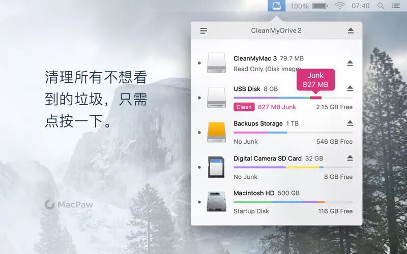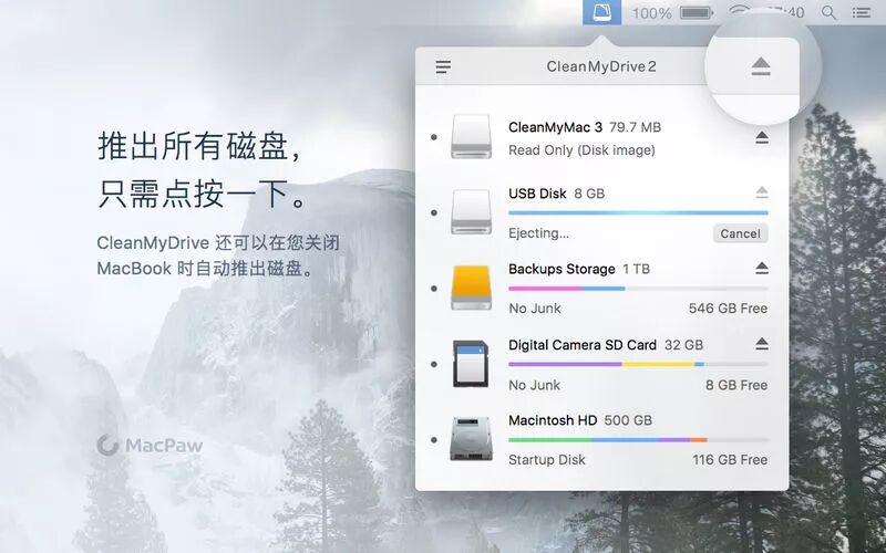 CleanMyDrive2可以管理所有外部驱动器磁盘,清理磁盘垃圾,将文件拖放到磁盘以及一键启动所有磁盘.