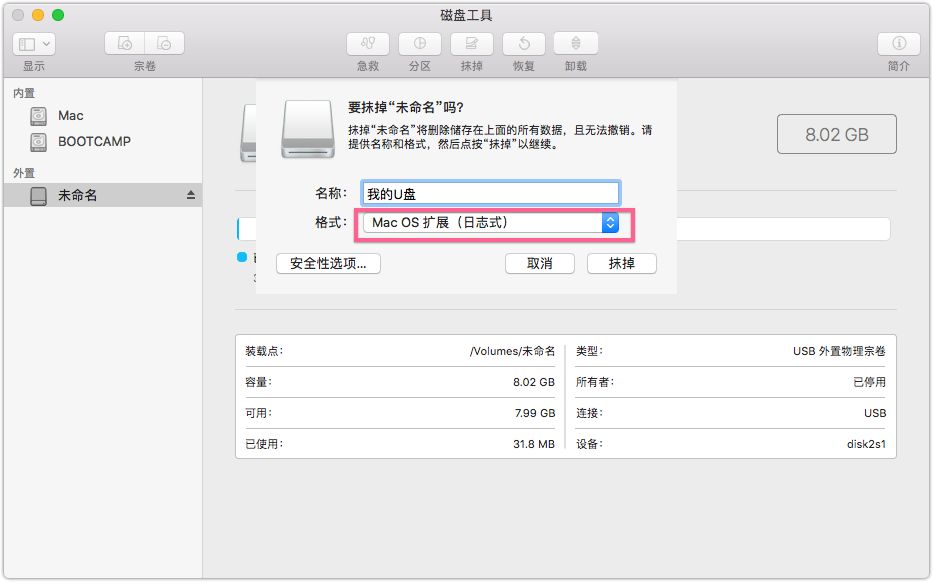 默认格式为“ Mac OS扩展(日志式)”,可以将名称更改为您喜欢的名称,单击[擦除].