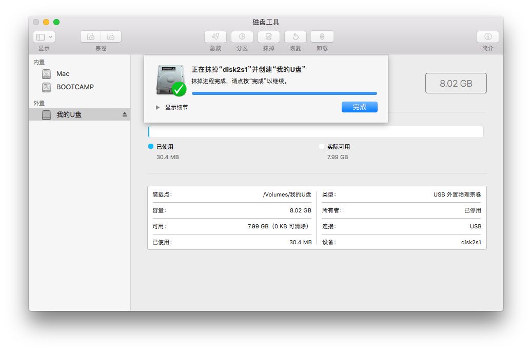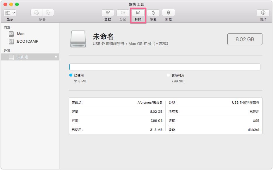 插入外部存储磁盘(例如U盘,移动硬盘,SD卡等),打开[Disk Utility],在左侧选择您的外部磁盘,然后单击上方的[Erase]按钮左.