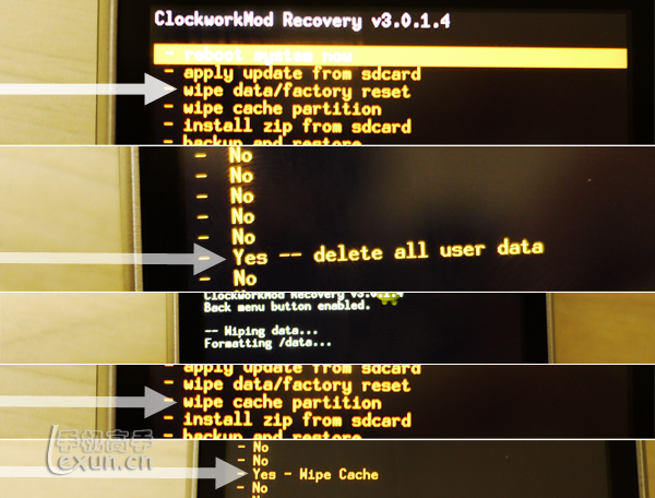 按音量键上下移动光标至“wipe cache partition”,按Home键确认进入,