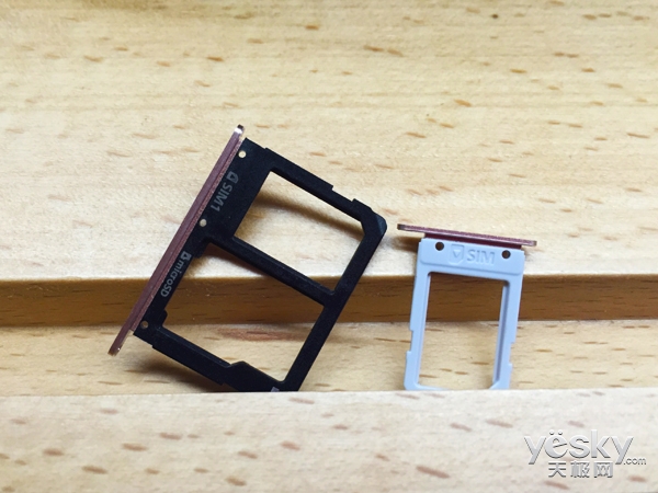 A5/A7 2016的SIM卡卡槽开在机身右侧电源键下方,集两枚NanoSIM卡和一枚microSD卡于一处,而A9 2016的机身右侧卡槽中仅集成了一枚NanoSIM卡和一枚microSD卡槽,另外一颗NanoSIM卡槽,开在机身顶部位置。