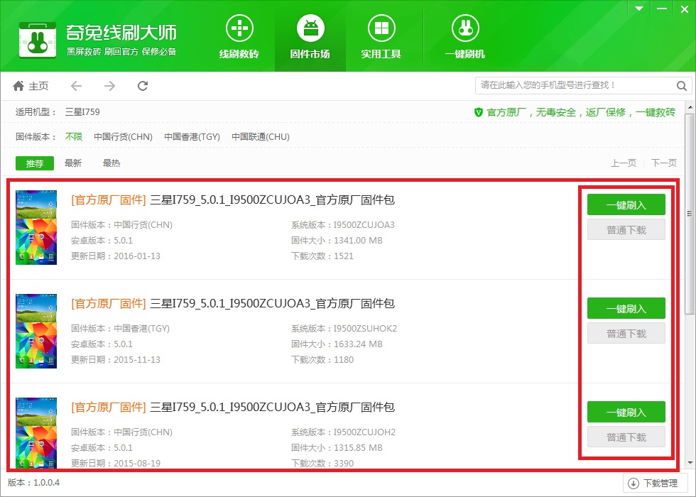 2、也可以在进入固件市场后,通过快速查找机型功能输入“三星”关键词,找到三星I759,选择三星I759救砖包点击“一键刷入”。注意一定要区分三星I759地区版本,否则手机将会彻底黑屏变砖。三星t759手机