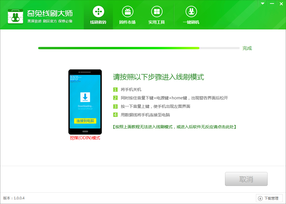 4、按照弹出的提示进入三星I759线刷模式,期间要保持三星I759手机挖煤模式!