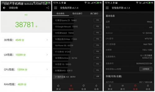 ▲魅蓝3跑分对比(测试软件:安兔兔6.0)