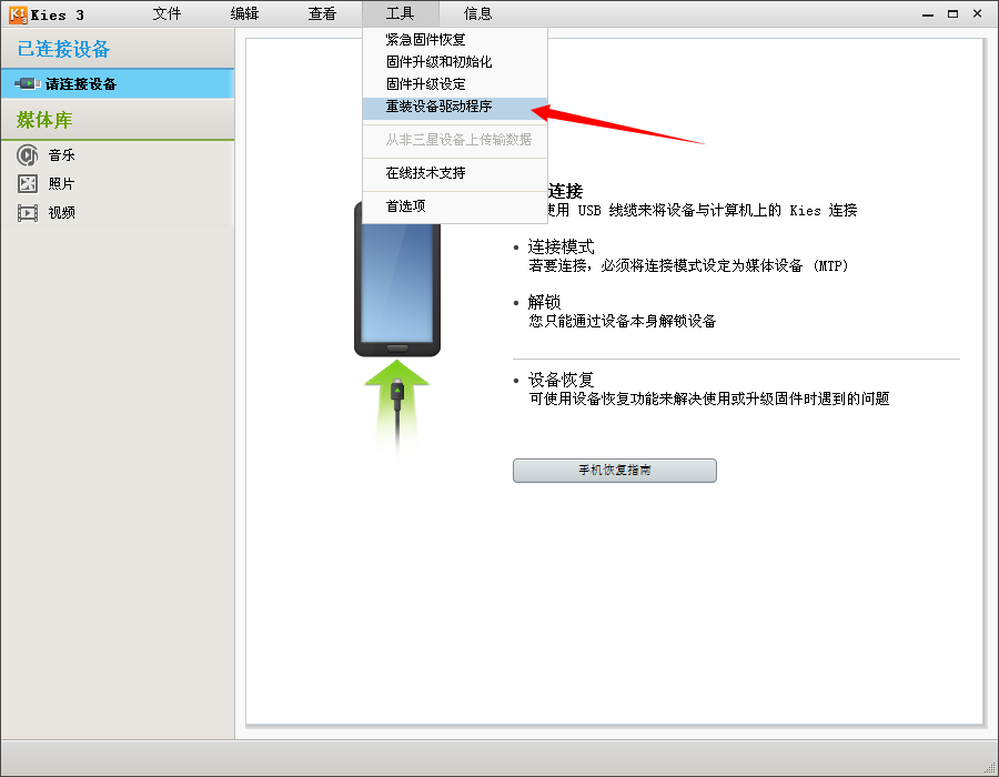 2、使用Kies中的【工具】---【重装设备驱动程序】来进行驱动的安装: