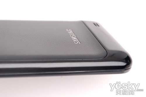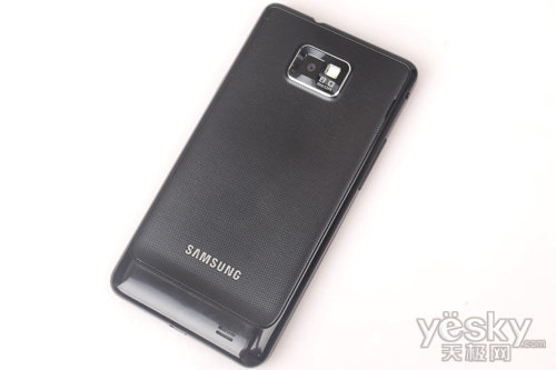 机身背部,三星GALAXY SII则看起来比较简洁大方,顶部为一枚800万像素的和LED闪光灯,下部为三星的LOGO。而且机背还做了特殊的纹理处理,不仅可以有效的防止指纹,还提升了持握时的手感。同时机背底部还拥有一定的坡度,手感极佳。
