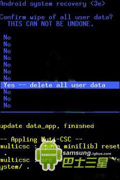3、用音量键移动到那个唯一的Yes-delete all user data(清除所有用户数据)上,按HOME键确认之后会再次回到一开始的界面;