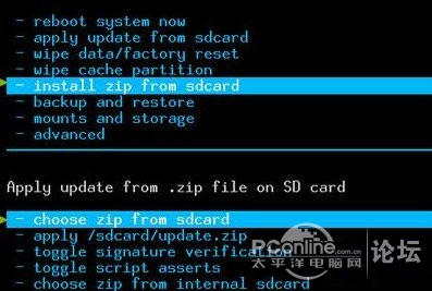 8、按音量键移动光标寻找刚才放入的“update.zip”Recovery包,并按Home键确认刷入;