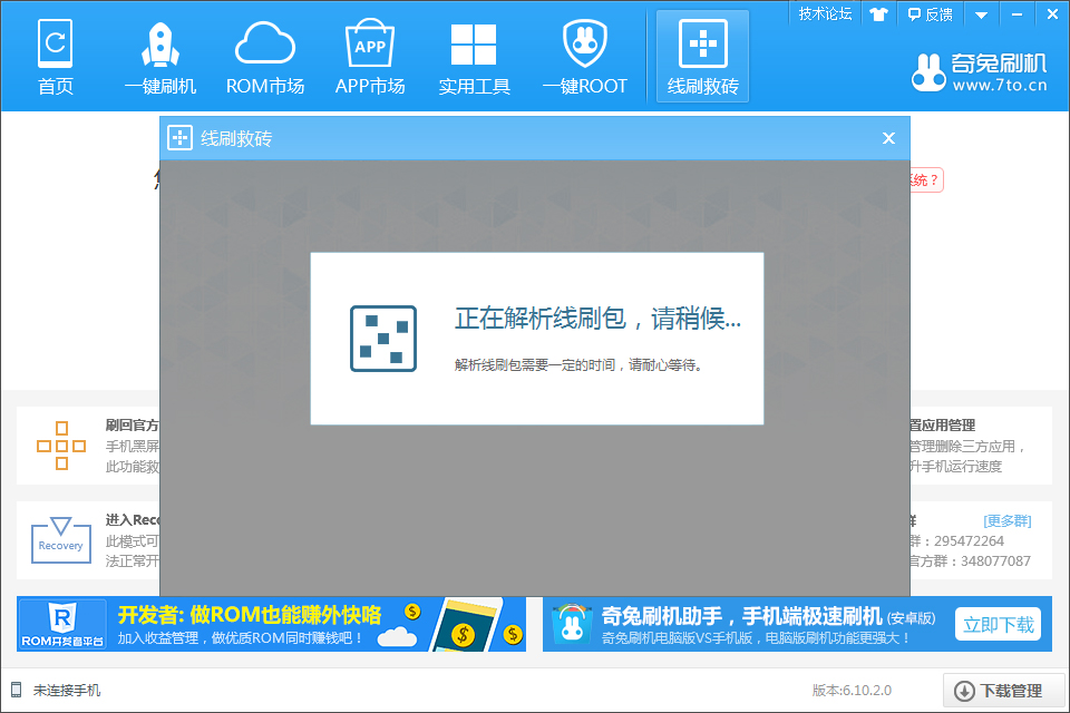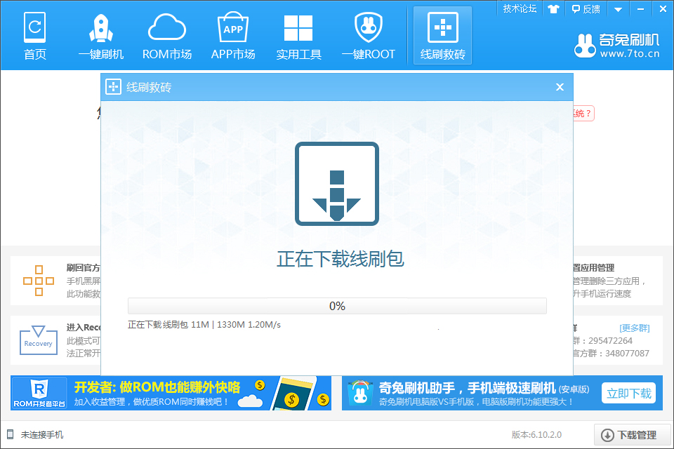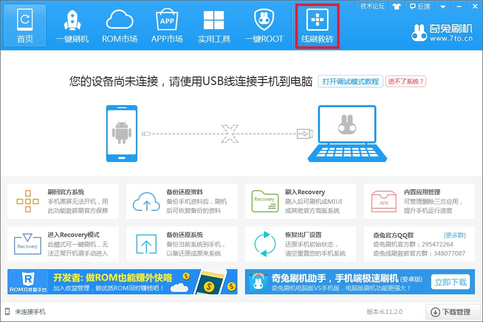 1、打开奇兔刷机软件(点击下载),点击“线刷救砖”功能(此时电脑不需要连接手机,如果连接上了可以先拔掉数据线)