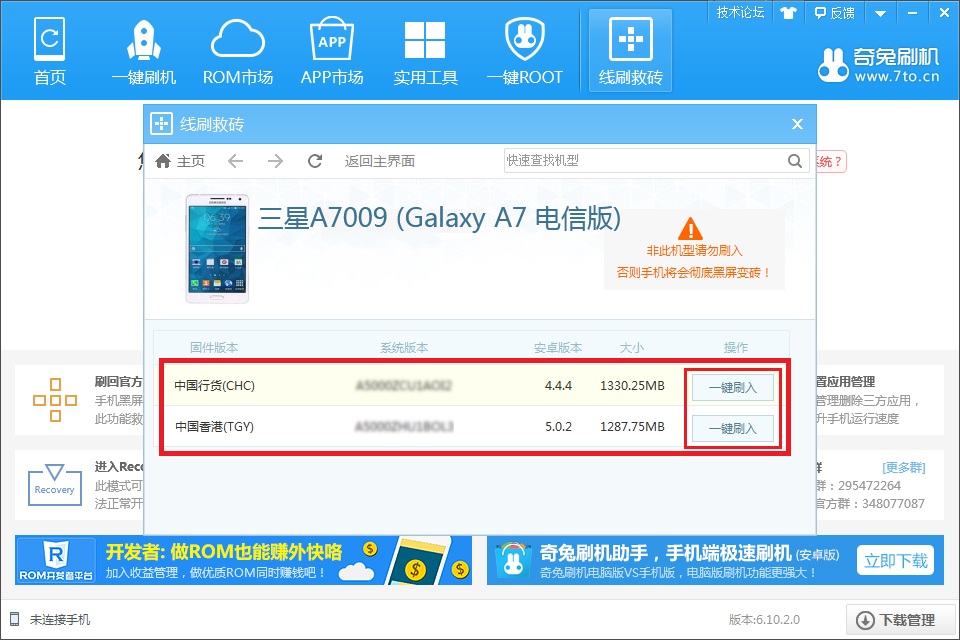 2、进入三星线刷包后,通过快速查找机型功能输入“三星”关键词,找到三星A7009 (Galaxy A7 电信版)然后点击“查看详情”,选择三星A7009 (Galaxy A7 电信版)救砖包点击“一键刷入”。注意一定要区分三星A7009 (Galaxy A7 电信版)地区版本,否则手机将会彻底黑屏变砖。