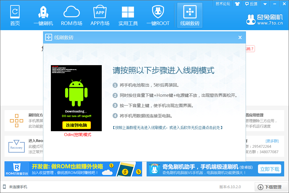 4、按照弹出的提示进入三星A7009 (Galaxy A7 电信版)线刷模式,期间要保持三星A7009 (Galaxy A7 电信版)手机正常连接状态!