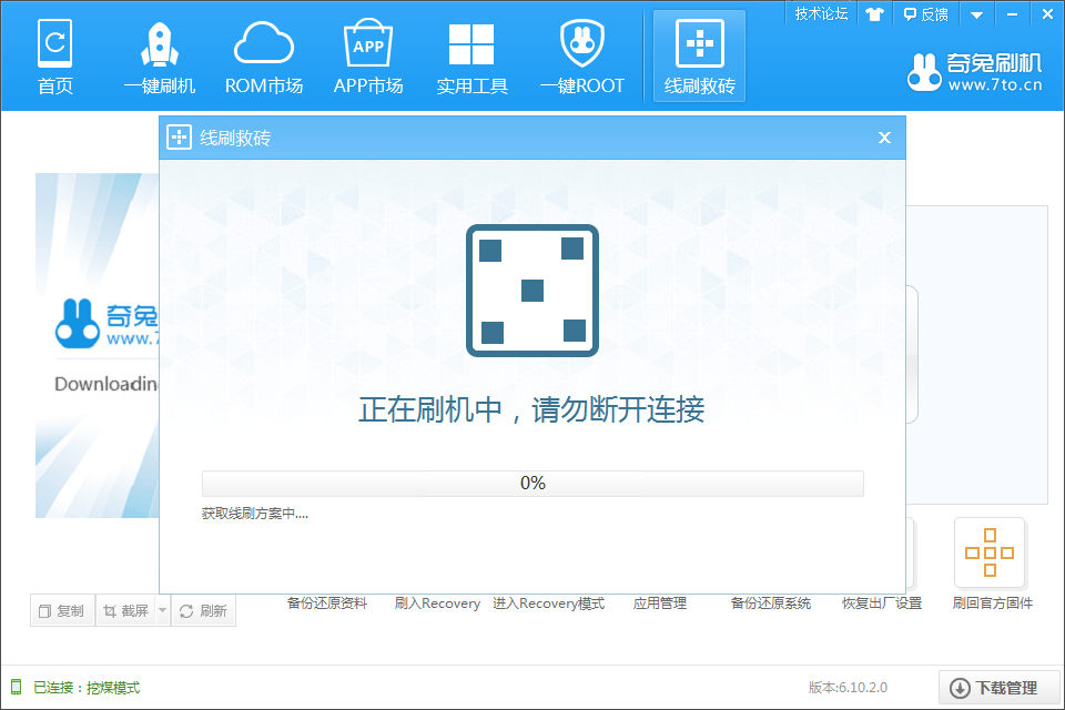 5、进入好对应的刷机模式之后,此时把手机连上奇兔刷机,软件会自动开始刷机。