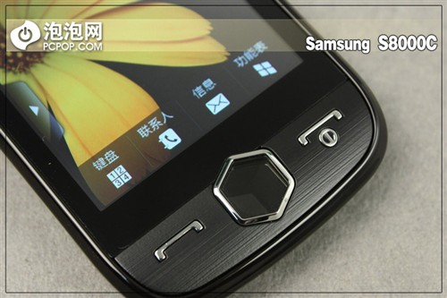 手机的功能键区同样是该机的特色之一,功能键区采用了金属拉丝面板,黑色的主色调中间配有一颗六角棱形按键,这是该机的菜单键,长按时可启动任务管理器,方便多任务进行时管理手机。菜单键的左右两侧分别是拨号和挂机按键。三星s8000c系统我们可以发现,该机的功能键区采用了弧度结构,这是根据人体工程学原理设计而来,使用者会发现,相比于普通处于同一水平面上的手机按键来说,带有下弧度的S8000C功能键区特别舒适。