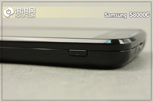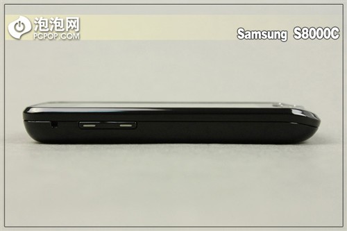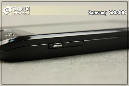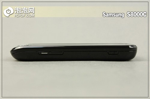 下面来看一下该机的周边设计,从该机的周边上我们能够发现,三星S8000C的整体设计是一个“梯形体“正面相比于背面来说要大上不少,这就直接造成了手机的侧面是一个斜面,但也正是这个斜面进一步加强了该机的整机握持感受。