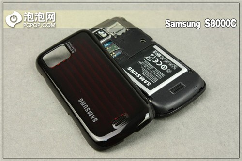 打开后盖,三星S8000C的电池仓设计分为三个部分,最上方的TF卡插槽,支持热插拔和最大16GB TF卡扩展。下方的则是开放式sim卡插槽,而最下方则是该机的电池区域了。三星s8000c系统