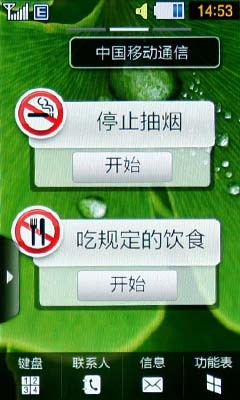 首先像一代一样,三星S8000C的主界面支持多种小工具显示模式,在手机待机界面的左侧面同样具有Wiz工具条,简单的拖动即可打开相应功能,同一代相比,TouchWiz2.0界面拥有更多的小工具软件,例如说天气插件和新闻插件等,该机还加入了“戒烟X天”这样的工具,非常的人性化吧。三星S8000C的主界面分成了三个页面,支持左右滑动屏幕更换,更加方便使用者桌面小工具管理。