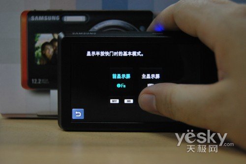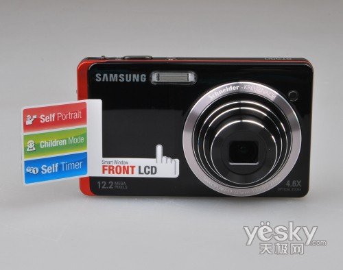 三星极具创新精神的为ST550设计了1.5”的前屏,在旁边的标签上清楚的标注着前屏的各种功能:自拍,儿童模式和倒计时。通过设置可以轻松控制前屏的开启和各种功能模式。