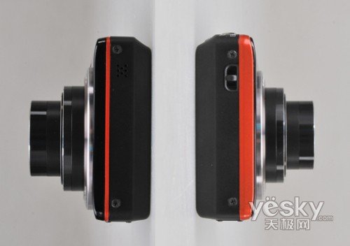 在相机机身中间带有彩色装饰条,使得机身正面和背面的界限划分非常清楚。不仅如此,它还能够给我们带来强烈的视觉冲击力,让我们体会到活灵活现的感觉。机身上方设有电源键、快门键及变焦杆、内置喇叭和回放键等部分。电源键和变焦杆可以由右手轻松掌控。只要按下电源键即可看到蓝色指示灯自动点亮。