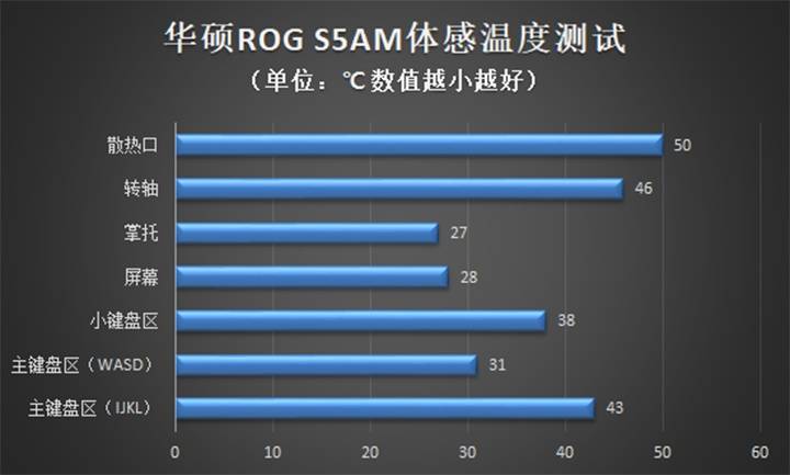 而从测温测试的体感温度测试结果来看,该游戏本的散热体统还是比较高效的。除了散热孔的50度以外,其他区域的温度均能保证在40度以下,从体感的角度来说,手在长工夫接触键盘、掌托的时分只会感觉温热,不会感觉到烫。