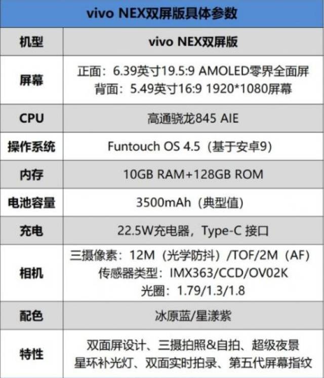 配置方面,vivo NEX采用骁龙845移动平台,内存分为标准版内存6GB RAM+128GB ROM和旗舰版内存8GB RAM+128/256GB ROM。