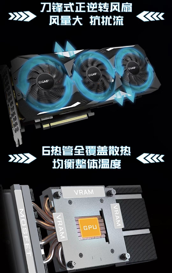 三风扇叶片式反向风扇设计,6个热管完全覆盖以散热!
