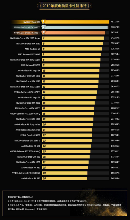 图形卡性能排名数据来自2019.01.01-2019.12.31. 为了减少利基产品(服务器)对清单的影响并使清单更有价值,所有数据样本都使用5000多个数据进行了测试. 有关详细信息,请转到Lu Master的公共帐户检查阶梯列表.