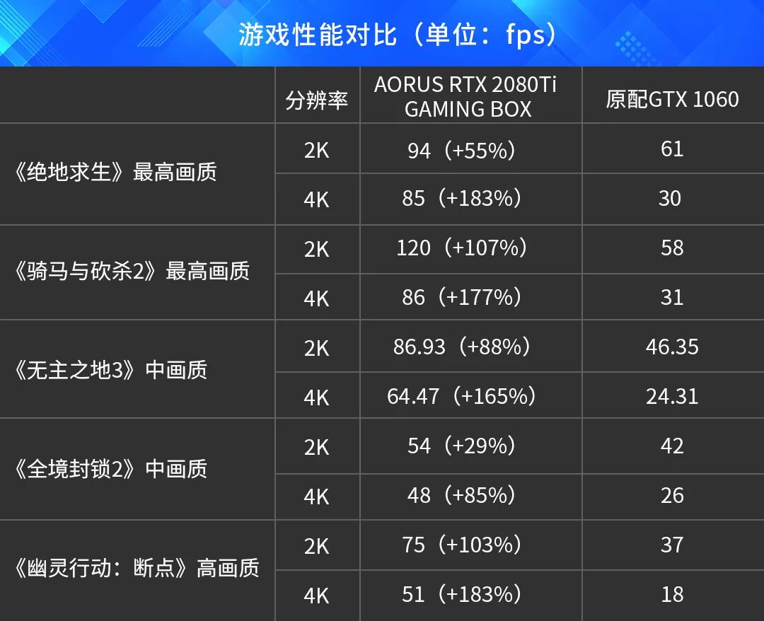 在硬件接口方面,只要笔记本电脑具有Thunderbolt 3接口,就可以升级AORUS RTX 2080Ti GAMING BOX. 例如,与升级后的原始GTX 1060显卡相比,我们测试的2017 Alien 15r3在性能上有巨大提升. 4K分辨率下的游戏帧速率几乎快一倍. 因此,我们建议两种解决方案. 一种是将旧笔记本电脑升级到AORUS RTX 2080Ti GAMING BOX,另一种是一步购买一台装有AORUS RTX 2080Ti GAMING BOX的轻薄笔记本电脑. 办公室游戏和发烧游戏都是正确且免费的. 获得高速接口扩展坞的功能. 当然,您还需要一台大尺寸,高刷新率的游戏显示器,才能享受AORUS RTX 2080Ti GAMING BOX提供的最高帧频. 此外,技嘉还发布了AORUS RTX 2070 GAMING BOX,玩家可以根据自己的预算进行选择.