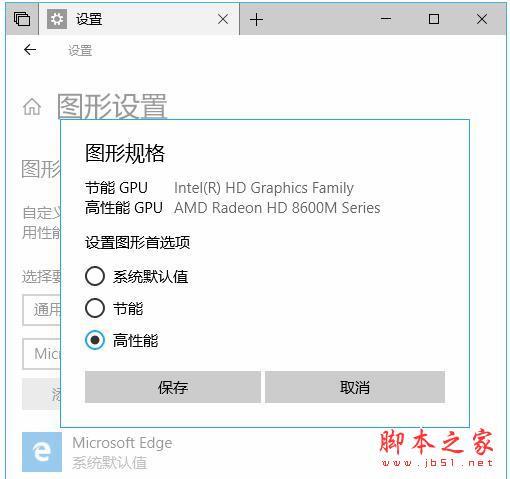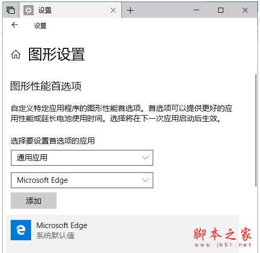选择“通用应用程序”,在应用程序列表中选择“ Microsoft Edge”,单击“添加”,Edge浏览器将添加到下面的列表中. 单击“ Microsoft Edge”项以显示“选项”按钮,然后单击以打开“图形规范”设置. 如图所示: