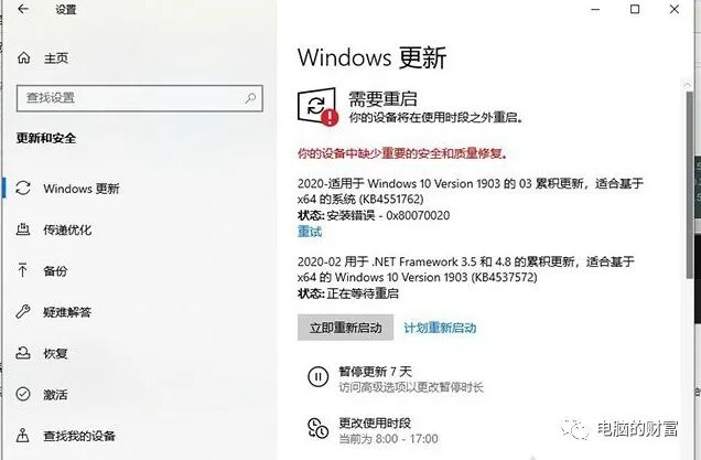 如果系统版本较低,则可能存在无法安装图形卡驱动程序的问题. 以Win10为例,我们可以单击开始菜单,单击“设置”齿轮的按钮,然后选择“更新和安全”以检查Windows中的第一项更新,然后等待它完成更新,然后自动安装. 更新完成后,单击“立即重新启动”.