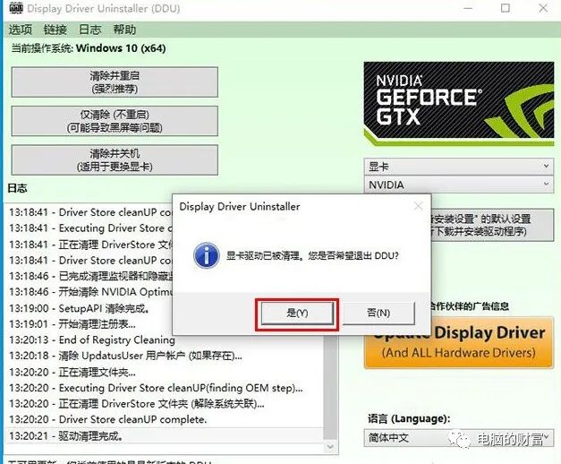 直到提示“图形卡驱动程序已清理,是否要退出DDU”,选择“是”,重启计算机后,我们可以再次安装图形卡驱动程序,并且“ Nvidia安装程序失败“在安装过程中弹出”是问题.