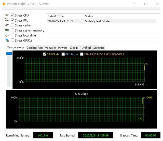 上图是AIDA64“系统稳定性测试”工具,该工具可以在CPU上进行压力测试以检查散热性能。其中包括“压力CPU”和“压力FPU”。一般而言,我们选中2。如果要执行极端按压,只需选中“ Stress FPU,这会给CPU施加更大压力。通常,我们可以运行15分钟,但理想时间是1小时。