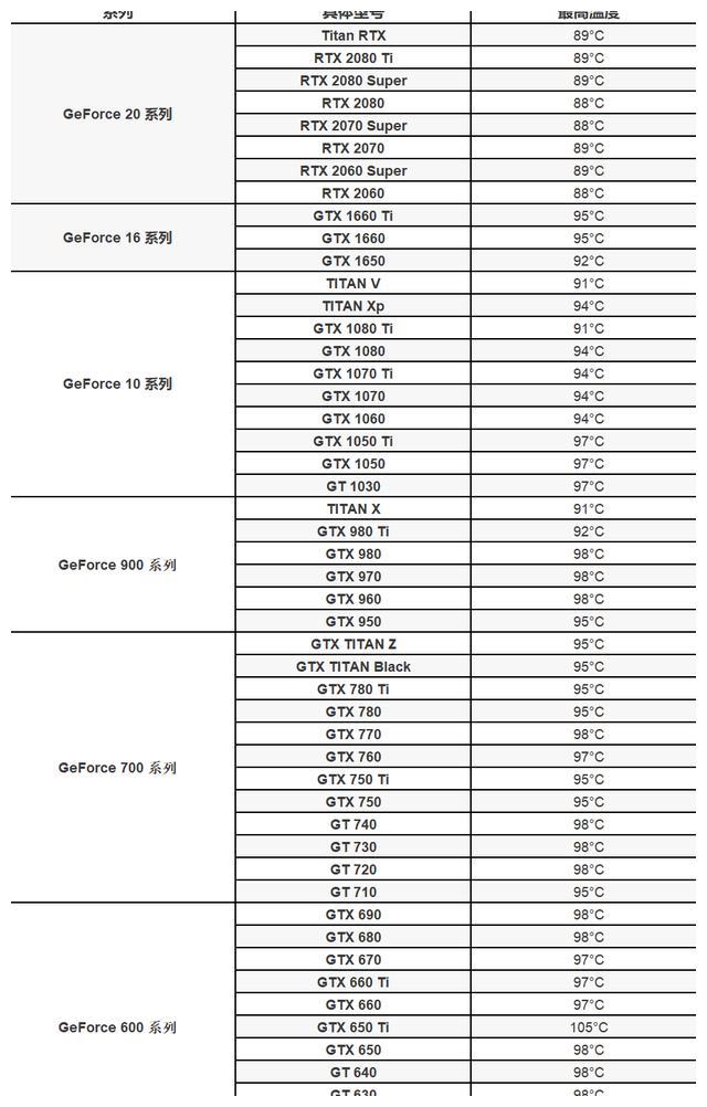 空闲状态下的最佳GPU温度应低于55°C。游戏中GPU的平均温度通常为60-80°C。下图是GPU温度的一部分。我们可以看到大多数Nvidia GPU的最高温度在90°C至100°C之间。至于AMD的显卡,没有相关的具体信息,但最高温度也应在90°C至100°C之间。通常,我们必须将GPU温度控制在85°C。以下。
