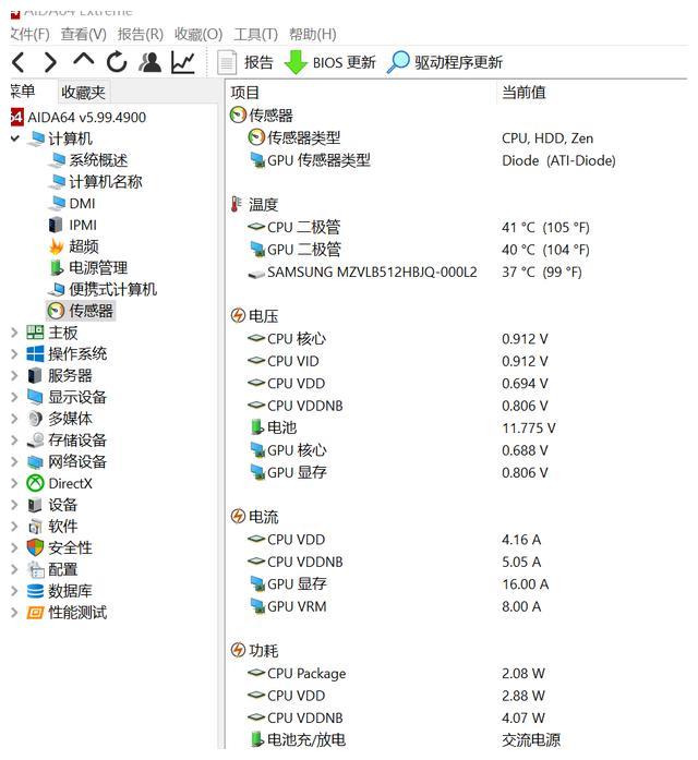 通常来说,如果仅是监视软件,则HWMonitor就足够了,它是免费的,并且没有广告。但是,如果需要检查散热性能,则AIDA64会更好。下图是AIDIA64的温度监控页面。我们可以看到CPU,GPU和硬盘的温度,电压,电流和功耗。