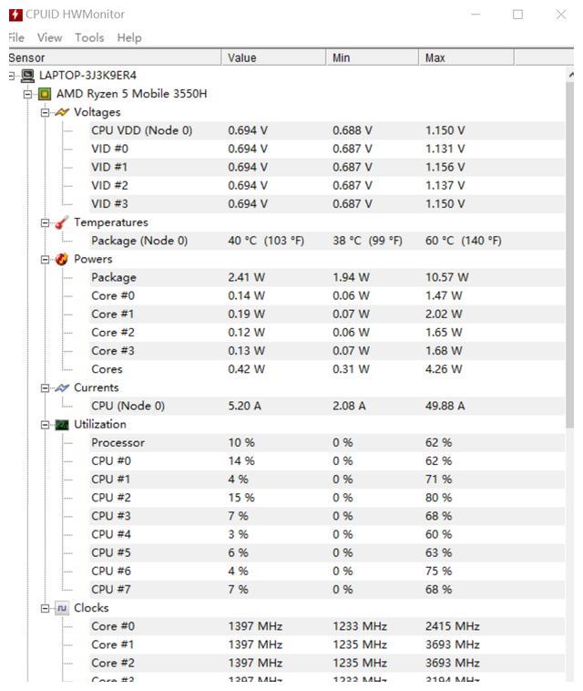 下图是HWMonitor的监视界面。我们可以看到其监视信息更加集中和详细。