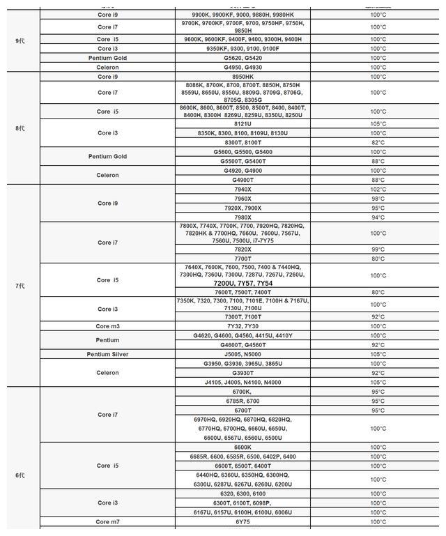 由于当前CPU具有自我保护功能,当CPU温度达到最高温度时,将采取措施降低频率以降低CPU温度并防止CPU由于高温而燃烧,但是我们仍然需要采取良好的散热措施,以确保当CPU全速运行时,温度大约比最高温度低10度。关于特定的CPU温度,您可以访问官方网站进行查询。下面是CPU的最高温度。