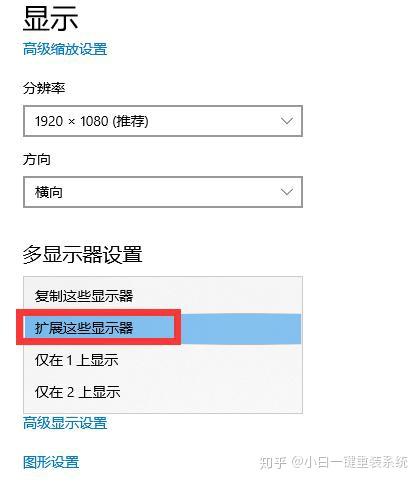 4、在显示界面中,找到[多显示器设置]并选择[扩展这些显示],然后这两个显示可以正常显示。