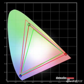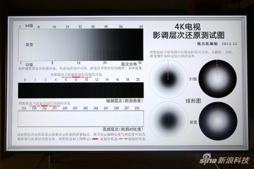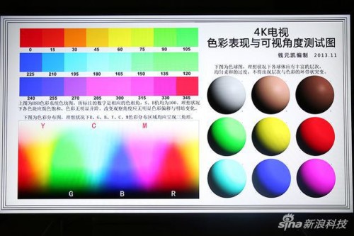 而色彩表现和可视角度测试图可看出色彩过渡平缓,左下不同颜色过渡也基本呈现了等腰三角形,还原准确。