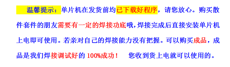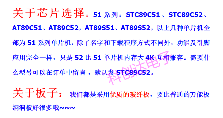 8、单片机可任选:STC89C51、STC89C52、AT89C51、AT89C52、AT89S51、AT89S52,默认发STC89C52.需要其他单片机请留言。
