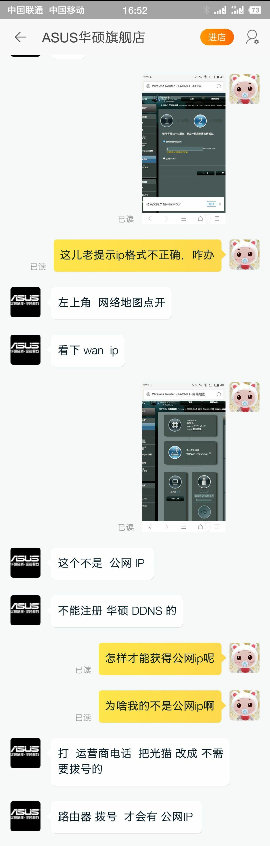 2、由于我家网络是光猫拨号,不是路由器拨号,所以路由器不能获得公网ip,无法实现路由器远程管理,而我已经离不开了小米路由器的远程下载和远程存储管理功能。华硕客服说让我用路由器替代光猫拨号(见聊天记录),找了移动的技术人员说NO!