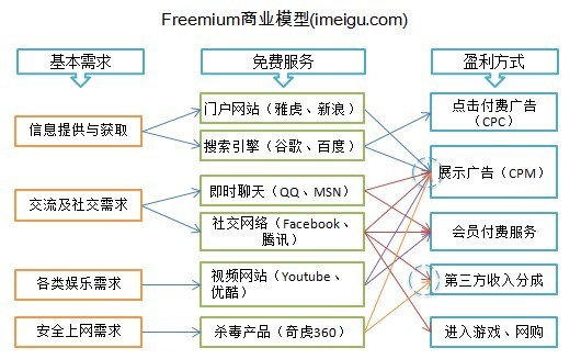 用免费的服务满足网民的基本需求(信息获得、社交、娱乐等),成为互联网流量及客户入口,在此基础上借助展示广告、付费服务、第三方分成等获得利润,这就是Freemium的精髓。