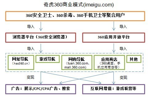 如上图所示,奇虎360商业方式能分为四层:第一层为核心免费产品服务层,主要为360安全卫士、360杀毒、360手机卫生等奇虎360赖以起家的产品,这些产品为奇虎360带来庞大的用户群;第二层为奇虎360两大基础系统——浏览器平台与应用开放系统,奇虎360将核心产品层用户顺势导入这两大平台;第三层为奇虎细分服务层,在两大平台基础上,奇虎360提供网址导航(hao360.cn)、团购导航(tuan.360.com)、游戏导航、应用商店等服务;第四层为最后盈利变现层,变现形式主要为广告与互联网增值服务。