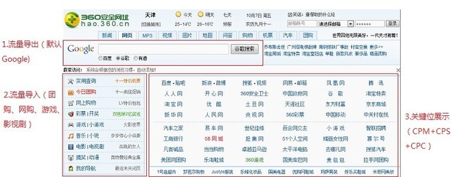 360网址导航顶部为搜索入口,盈利方式为流量导入费,默认搜索引擎为Google。360网址导航的左边及上部为关键位展示,盈利方式为广告(包括CPM\CPS\CPC),这块也是360网址导航最赚钱的地方。360网址导航左边为团购、网购、游戏、影视剧等入口,团购盈利方式为广告,游戏利润模式为分成,影视剧盈利方式为广告跟分成。