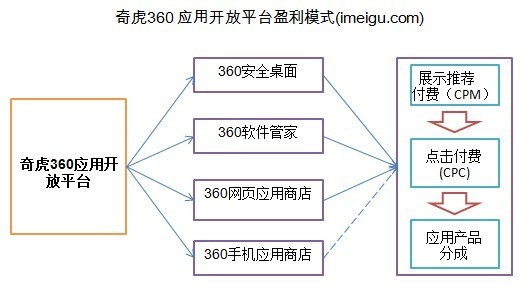 当用户点击推荐应用后,奇虎360会计算点击数量,按点击收费(即CPC广告);而当客户使用付费应用后,奇虎360又会与应用开发者进行分成。于是在整个应用开放系统上,奇虎360完成“展示-点击-分成”整个盈利模式的打造。