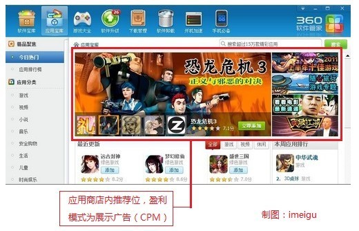为更明白说明应用开放系统盈利模式,下面以360软件管家为例。当用户开启软件管家后,会发现应用宝库,其中包含热门应用及其推荐应用。在应用宝库中拥有应用推荐位,推荐位会扣除展示推荐费,即展示广告(CPM),如下图: