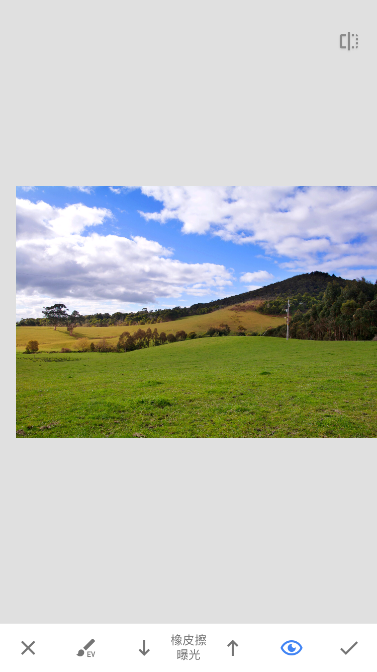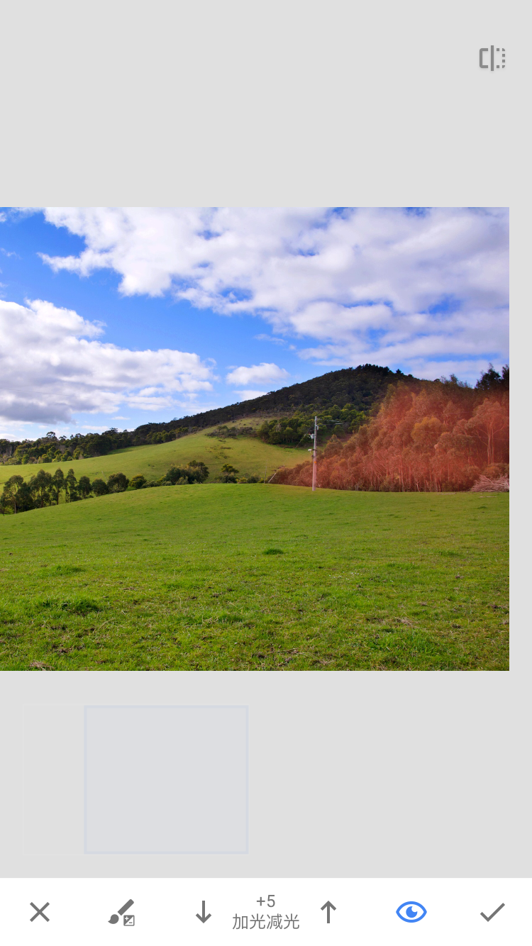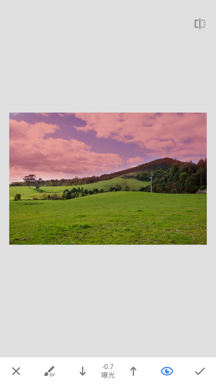 然后,使用手机端的Snapseed打开素材进行基础调整。由于草地在照片中占的比重较大,故先以草地为基准进行微调,提高帧率,饱和度,对比度,降低一些高光,提高一些阴影。这样一来天空部分就显著过曝了。下图是基础调整过后的截图。