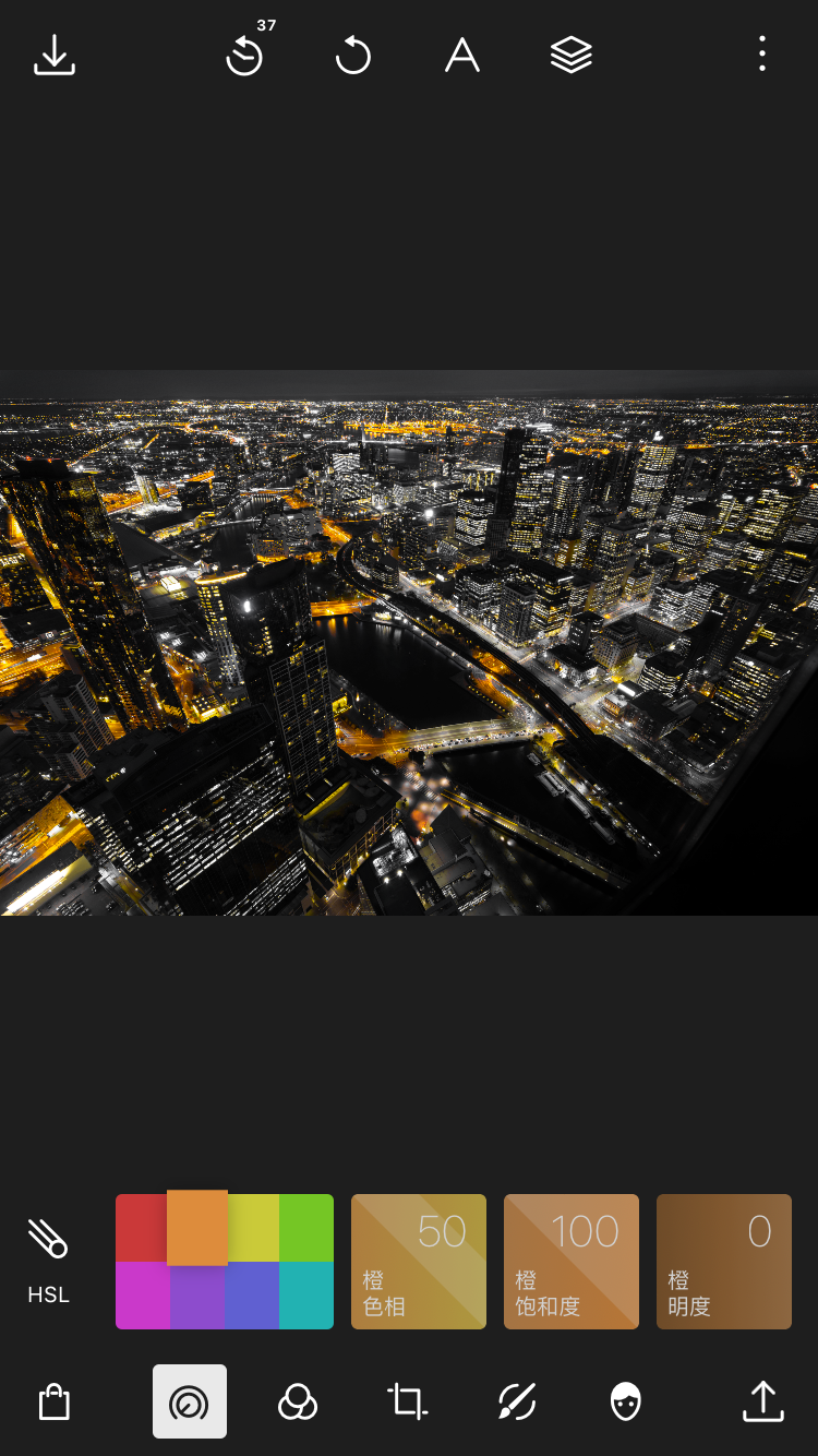 操作方法很简单,就是在泼辣修图的HSL功能中将除了黑色以外的所有色彩的饱和度降为0,再把红色的色相调到50,就大功告成了。