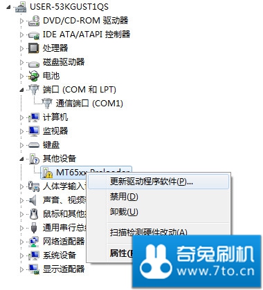 这时,带有问号(或感叹号)的设备将出现在设备管理器中,右键单击“更新驱动程序”